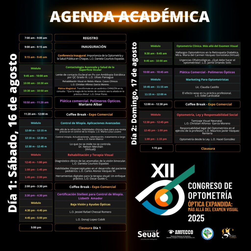 Bienvenidos al XII Congreso de Optometría Óptica Expandida : más allá del examen visual, un evento organizado por la SEUAT, Chiapas, cuyo principal objetivo es reflejar la verdadera esencia de la optometría, una profesión que va más allá de realizar exámenes visuales y vender armazones, a través de diferentes actividades académicas y de servicio social.